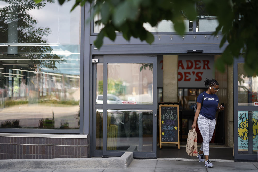 6月14日,在美国华盛顿,一名女子提着购物袋走出一家食品超市
