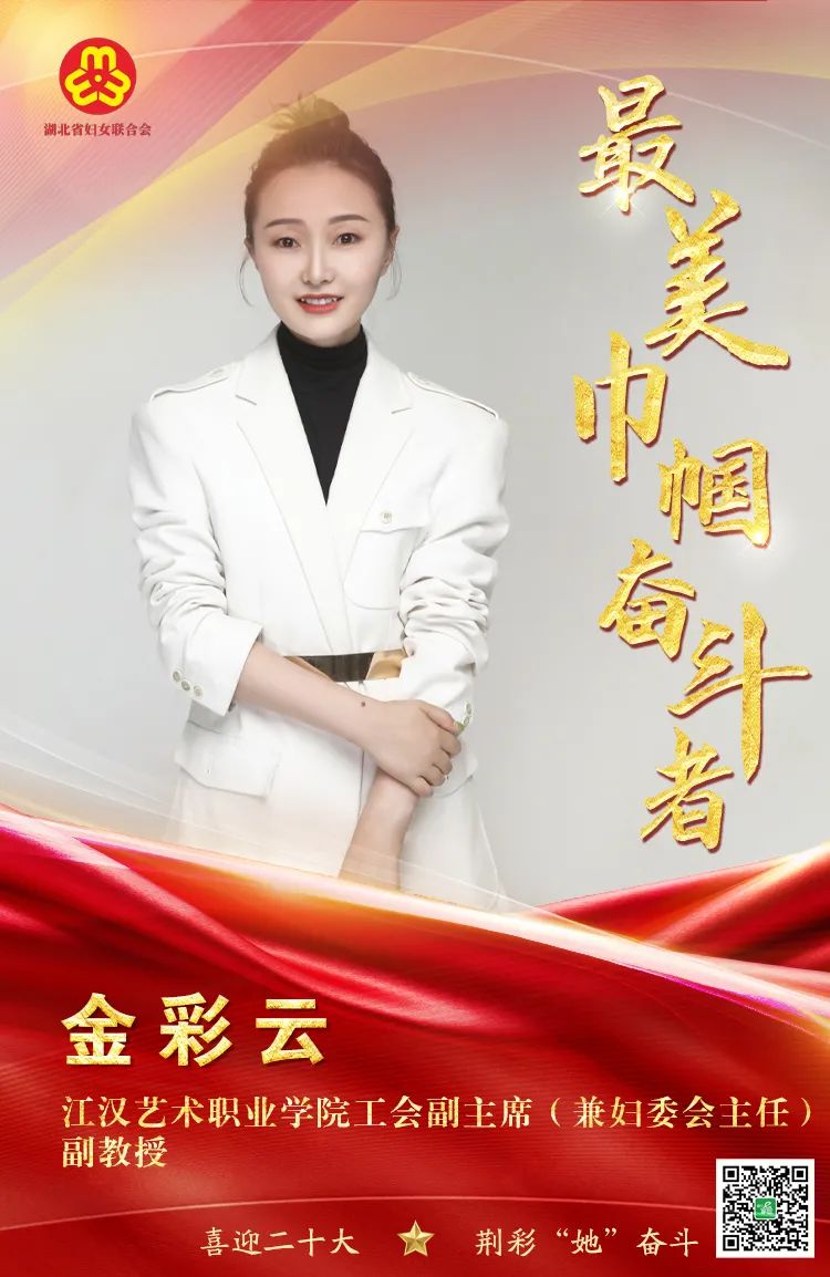 金彩云,江汉艺术职业学院骨干教师,副教授,潜江市优秀教师,潜江市政协委员,湖北省普通话测试员,湖北省朗诵艺术家协会会员,曾担任过学校团委书记,现任学校工会副主席、工会办主任,并兼任学校妇委会主任。参加工作十多年来,一直奋战在教学一线,始终做到对工作一丝不苟,以校为家,对学生关怀备至,对事业孜孜以求,以爱岗敬业、无私奉献的精神,以倾情关爱、精心育人的情怀,以不计得失、任劳任怨的态度,以工作突出、成绩优秀的业绩,获得领导同事的好评和学生的信赖。