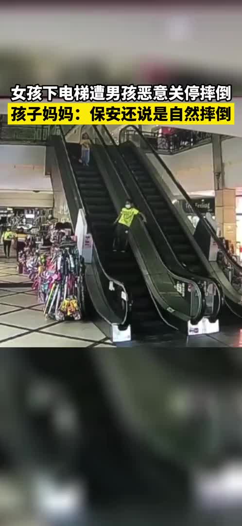8月16日,广东深圳。一名男孩和5岁小女孩一起乘扶梯,男孩下电梯后将电梯关停,导致小女孩没站稳,直接从扶梯上摔倒滚落。