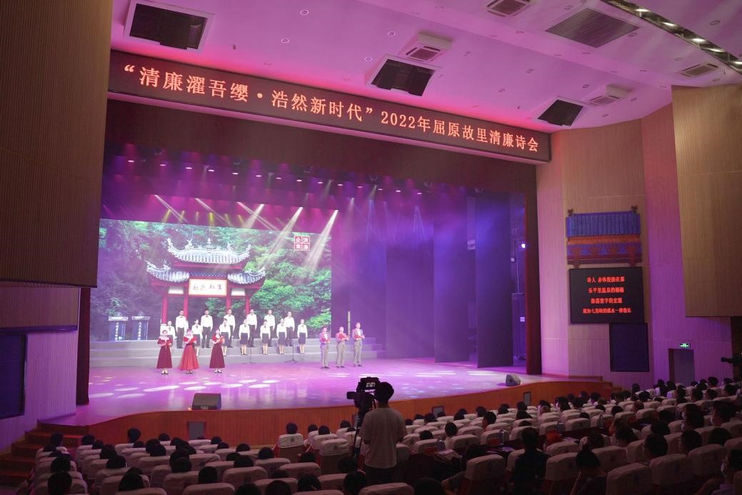 秭归县以屈原廉洁文化建设为主线,持续开展系列清廉主题文艺活动,组织党员干部诵读屈原廉洁诗篇、演绎屈原廉洁故事、传承屈原廉洁精神,以屈乡“廉韵”传播清风“廉味”,引导全县广大干部群众弘扬优秀传统文化、廉洁文化,涵养良好家风社风民风。图为该县纪委监委在屈原剧场组织开展清廉诗会。