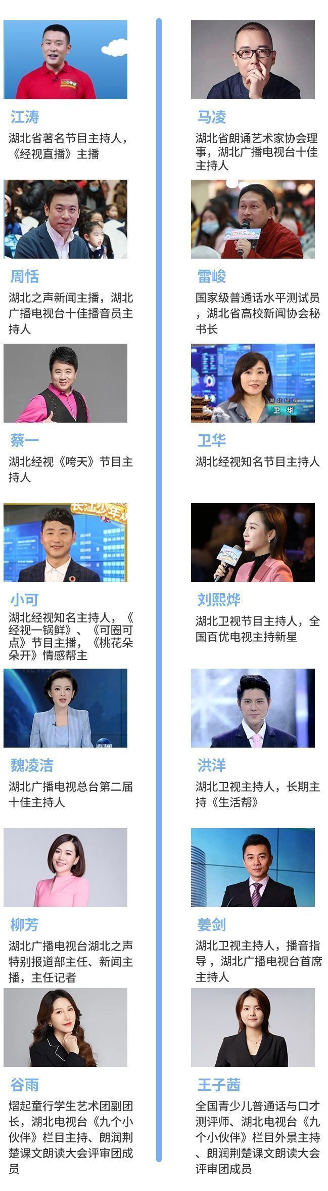 9、“2022长江之星”时代宣推官将在第三届“长江少年说”湖北省语言艺术展演年度颁奖盛典同知名主持人、朗诵名家、语言专家同台表演、合影留念,为能力与经验背书。