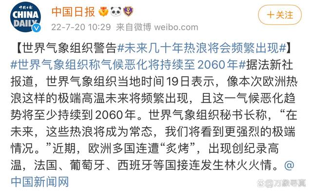 世界气象组织近日表示,未来全球极端高温天气会变得更普遍,这种情况或持续到2060年,“为全球敲响警钟,需进一步遏制全球变暖”。