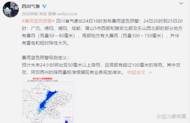 四川省气象台8月24日16时发布暴雨蓝色预警:24日20时到25日20时:广元、绵阳、德阳、成都、眉山5市西部和雅安北部及乐山西北部的部分地方有暴雨(雨量50~80毫米),局部地方有大暴雨(雨量100~150毫米),并伴有雷电和短时阵性大风。