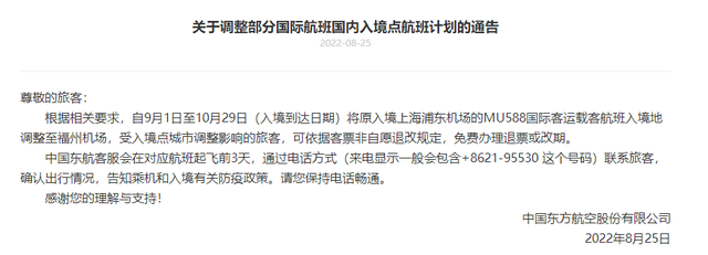 此外,东方航空调整部分国际航班国内入境点。根据相关要求,自9月1日至10月29日(入境到达日期)将原入境上海浦东机场的MU588国际客运载客航班入境地调整至福州机场,受入境点城市调整影响的旅客,可依据客票非自愿退改规定,免费办理退票或改期。