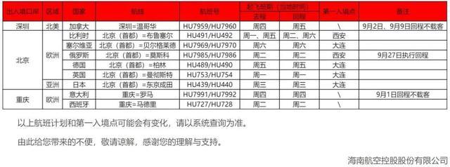 自2022年9月1日0时至9月30日24时,海南航空每周可执行国际航线9条,具体计划和第一入境分流点如下: