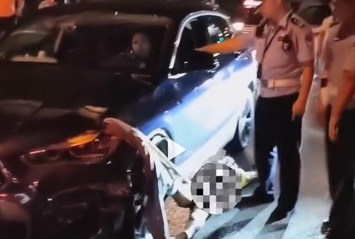 宝马车驾驶座一侧车轮下方有一位伤者横躺,衣服破损,疑似被拖拽了较长距离。现场有目击者喊“打120”。