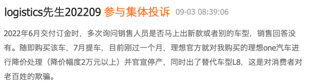 还有车主表示,自己在2022年6月交付订金时,多次询问销售人员是否马上出新款或者别的车型,销售回答没有。随即购买该车,7月提车,目前刚过一个月,理想官方就对自己购买的理想one汽车进行降价处理(降价幅度2万元以上)并官宣停产,同时出了替代车型L8,这是对消费者的欺骗。