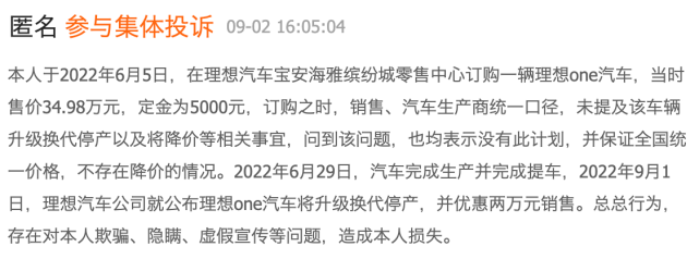 据了解,车主投诉的理由基本都与理想ONE在9月1日刚刚宣布的理想ONE车型将升级换代停产,并优惠两万元销售有关。有车主表示, 自己于2022年6月5日,订购一辆理想one汽车,当时售价34.98万元,定金为5000元,订购之时,销售、汽车生产商统一口径,未提及该车辆升级换代停产以及将降价等相关事宜,问到该问题,也均表示没有此计划,并保证全国统一价格,不存在降价的情况。2022年6月29日,汽车完成生产并完成提车。但就在9月1日,理想汽车公司就公布理想one汽车将升级换代停产,并优惠两万元销售。该车主认为,理想汽车公司的种种行为,存在欺骗、隐瞒、虚假宣传等问题。