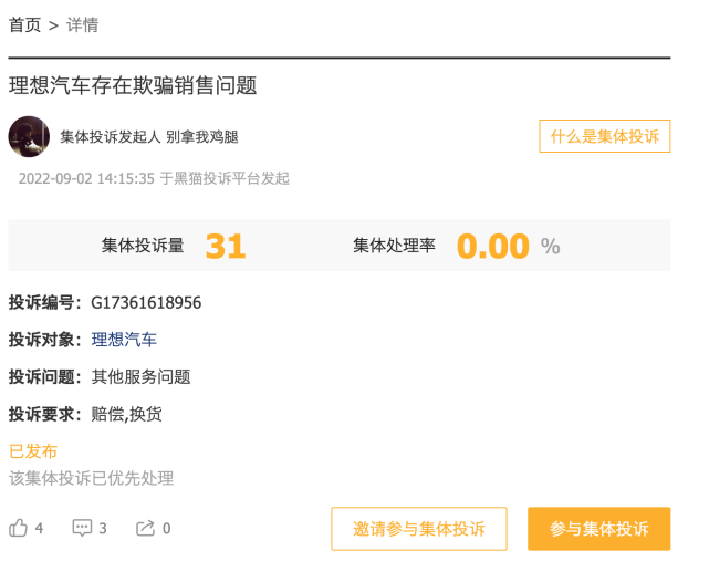 Tech星球9月3日消息,近日,大量理想汽车车主在黑猫投诉平台投诉理想汽车存在欺骗销售问题。还有车主发起了集体投诉,截止发稿,该集体投诉量为31,但当前的集体处理率为0。