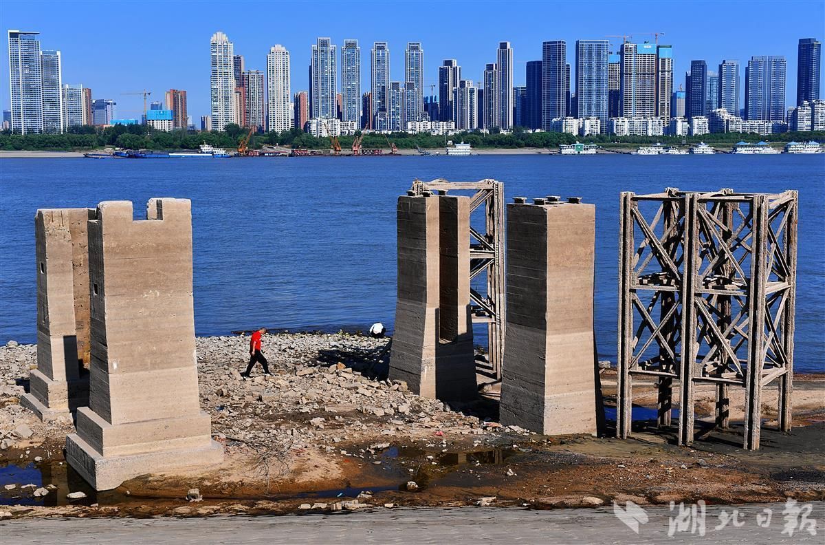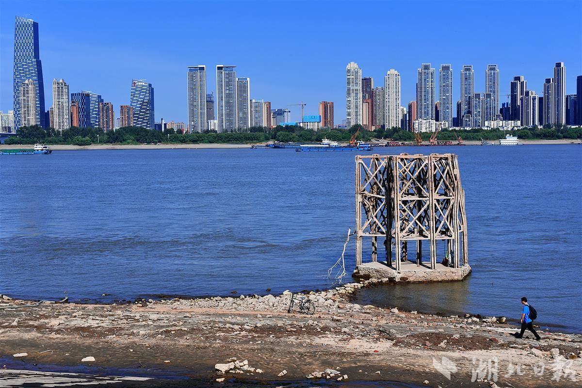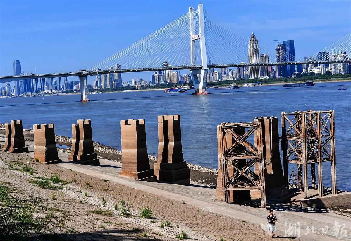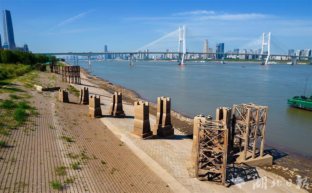 9月3日,武汉长江二桥武昌桥头下,一条锈迹斑斑的铁轨已裸露在沙滩上,十余个生锈的铁塔和水泥石墩默立在空旷的长江边,依稀能让人回想起这里当年的热闹和繁华。