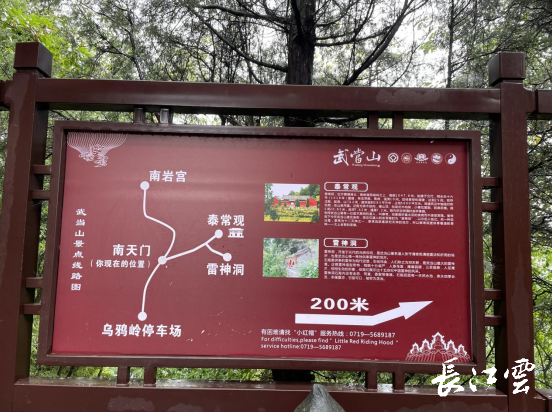沿着南岩景区游步道一路前行,顺着右边的分岔路攀爬,一座南天门赫然映入眼帘。南天门是一个通道,这里下可通往南岩宫,上可通往雷神洞、泰常观。从这里步行几分钟,就来到了一个岔路口,路旁立着的牌子指引我们进入林中。