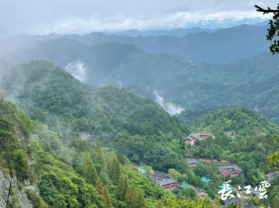 从石殿出来,此刻雷神洞外云海缥缈,从绿树的空隙中下可俯视紫霄宫,前可瞭望金童玉女峰,视野十分开阔。在这个气候宜人的秋季,来武当邂逅风雨,邂逅秋色,更是别有一番韵味。