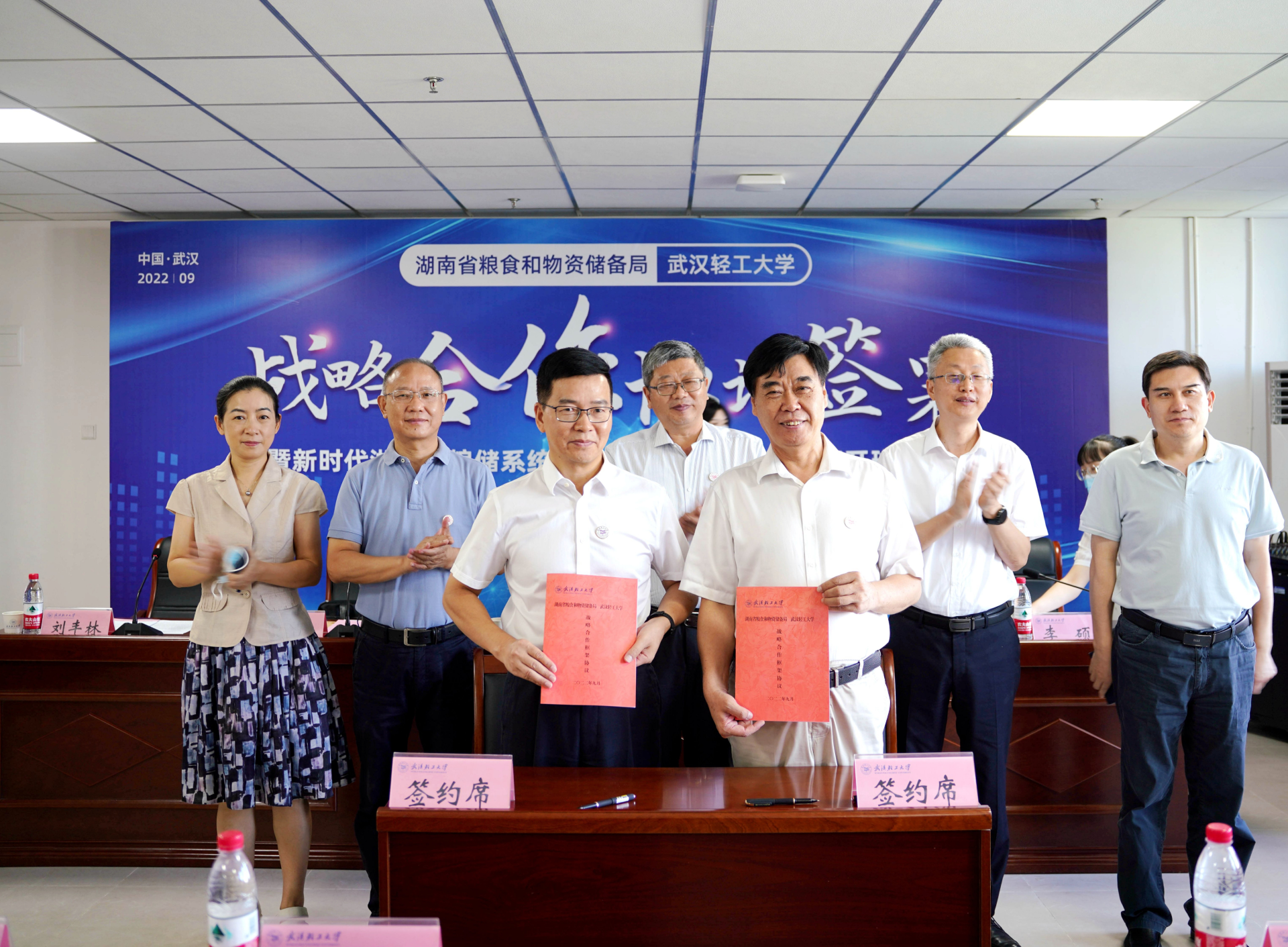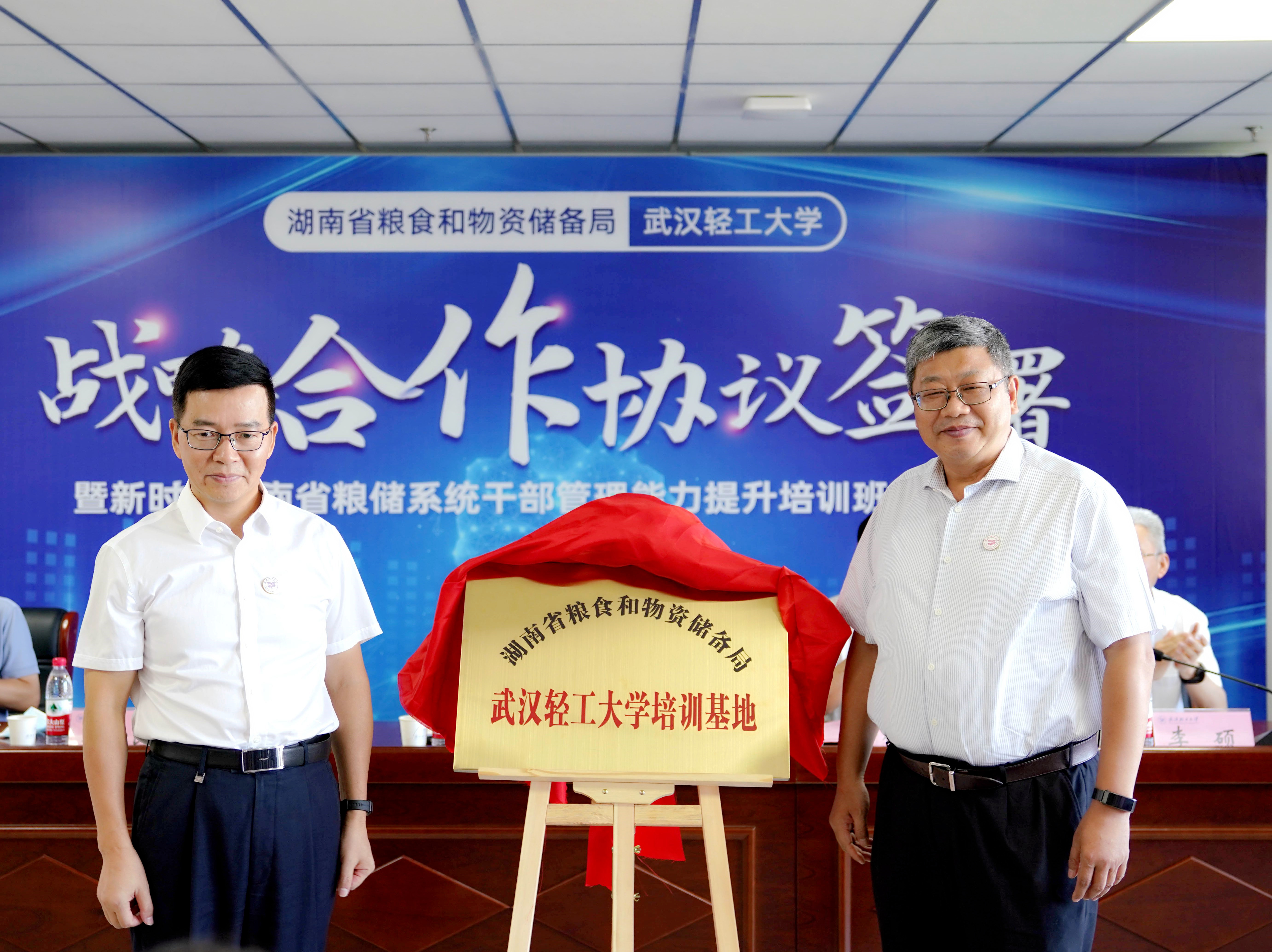 在与会人员的共同见证下,覃世民、王立兵为湖南省粮食和物资储备局武汉轻工大学培训基地揭牌。覃世民、董仕节分别代表湖南省粮食和物资储备局与武汉轻工大学签署战略合作框架协议。