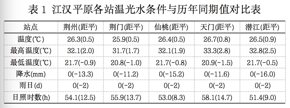 上周受冷空气影响,高温天气有所缓解,但无明显有效降水天气过程,气象干旱仍将持续。持续干旱导致部分灌溉条件较差地区稻田因缺水出现龟裂、稻株干枯,棉花等旱地作物脱肥早衰,水产养殖塘蓄水深度低、水质变差,对处于产量形成关键期的水稻、棉花以及鱼虾生长不利。江汉平原各站的温光水条件具体情况见下表1。