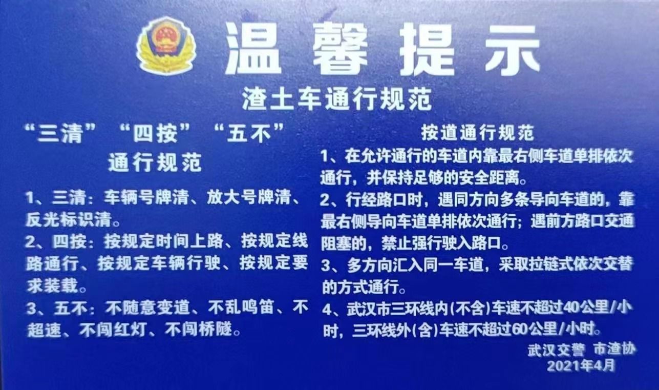 9日晚22时37分,民警李辉带队在成功大道与通城大道路口开展巡查时,发现迎面驶来的一辆红色重型厢式货车车头安装了射灯,异常刺眼,根本看不清车辆号牌。民警立即组织队员上前拦停车辆,并指挥驾驶员将车辆安全停靠在路边接受检查。据驾驶员宋某交代,其安装射灯的主要意图是为了躲避电子警察的处罚。民警李辉听后对其进行了严厉的批评教育,明确告知其私自安装射灯的危害,责令其立即拆除违规设备,并向其发放了一份《三清四按五不》宣传卡片,倡导安全、守法、文明驾驶。
