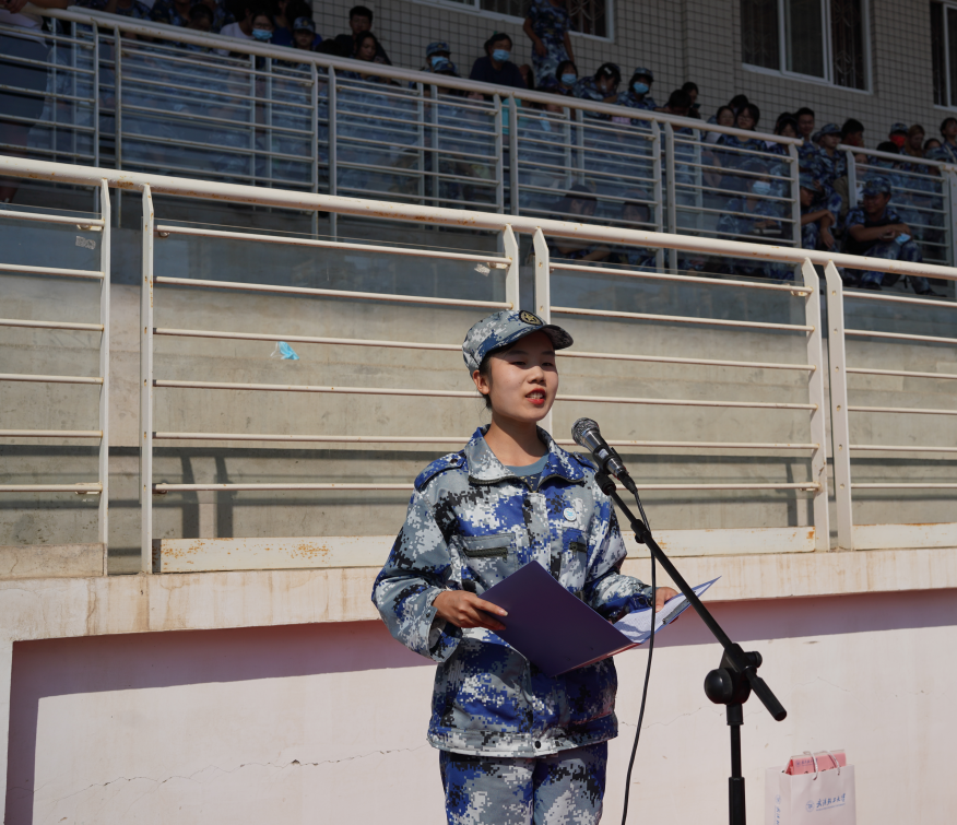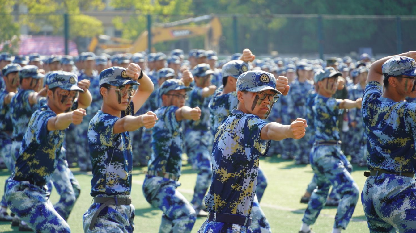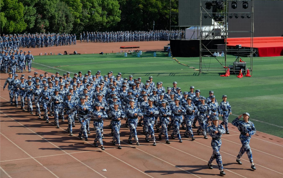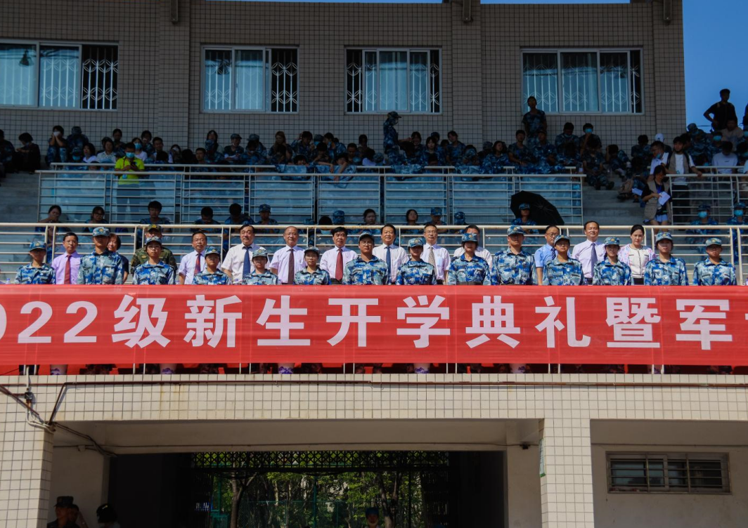 现场还举行了军训会操表演,新生们身着迷彩服,迈着矫健的步伐,齐声喊出“为校争光”的响亮口号。台上的领导们为新生代表佩戴校徽,全体2022级本科新生佩戴校徽,气宇轩昂,充满对未来校园生活的期待。