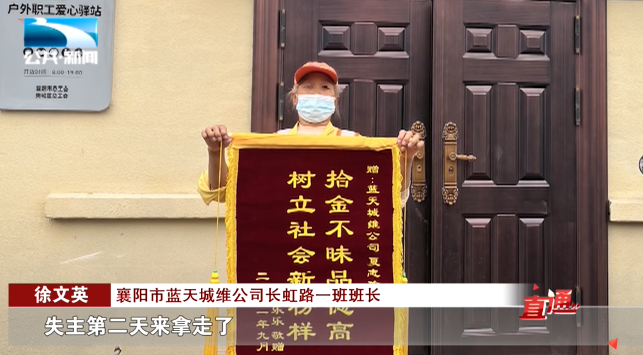 襄阳市蓝天城维公司长虹路一班班长 徐文英:“我们工人有一天晚上在共享单车里面捡了一个包,里面有手机,那个失主第二天来拿走了,过了一段时间还给我们工人搞了一个锦旗。”