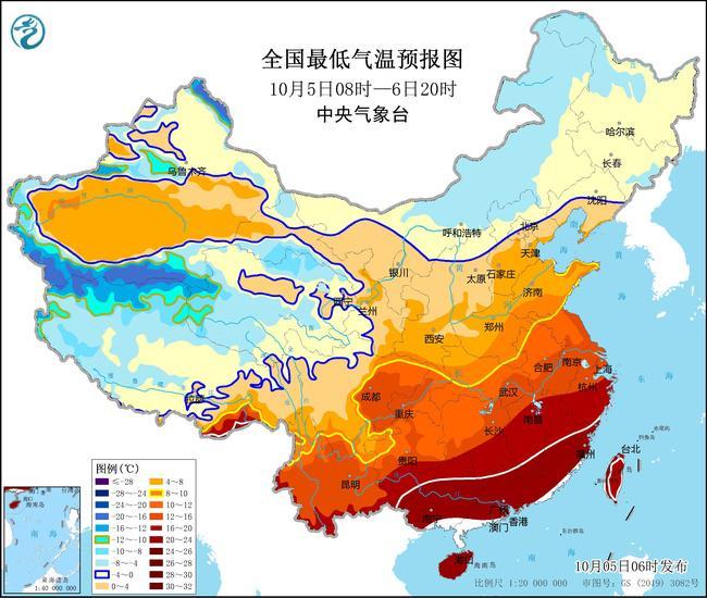 受强冷空气影响,预计,10月5日08时至10月6日20时,江南大部、西南地区东部、华南北部、青海北部和东部等地部分地区将先后降温4~6℃,局地降温幅度可达8℃以上。最低气温0℃线将位于华北北部至辽宁中部一带,最低气温10℃线将位于四川东北部、湖北南部、河南南部至苏皖北部一带。辽东半岛、黄淮东部、江淮东部、江汉东部、江南北部等地部分地区有4~6级偏北风。东海南部、台湾海峡有6~7级东北风,台湾海峡部分海域风力可达8级,阵风9级。