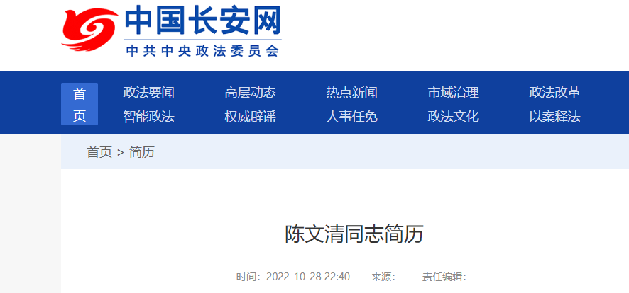 10月28日,中国长安网发布的陈文清同志简历显示,陈文清已任中共中央政法委书记。