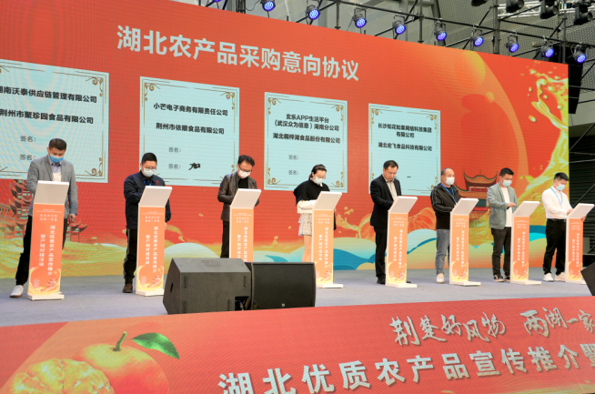 会上,荆门漳发农业、枝江年祥果业、荆州依顺食品等8家农企与长沙渠道商现场签订采购意向协议,总金额过亿元,更多订单还在进一步洽谈中。