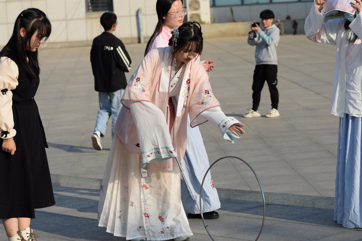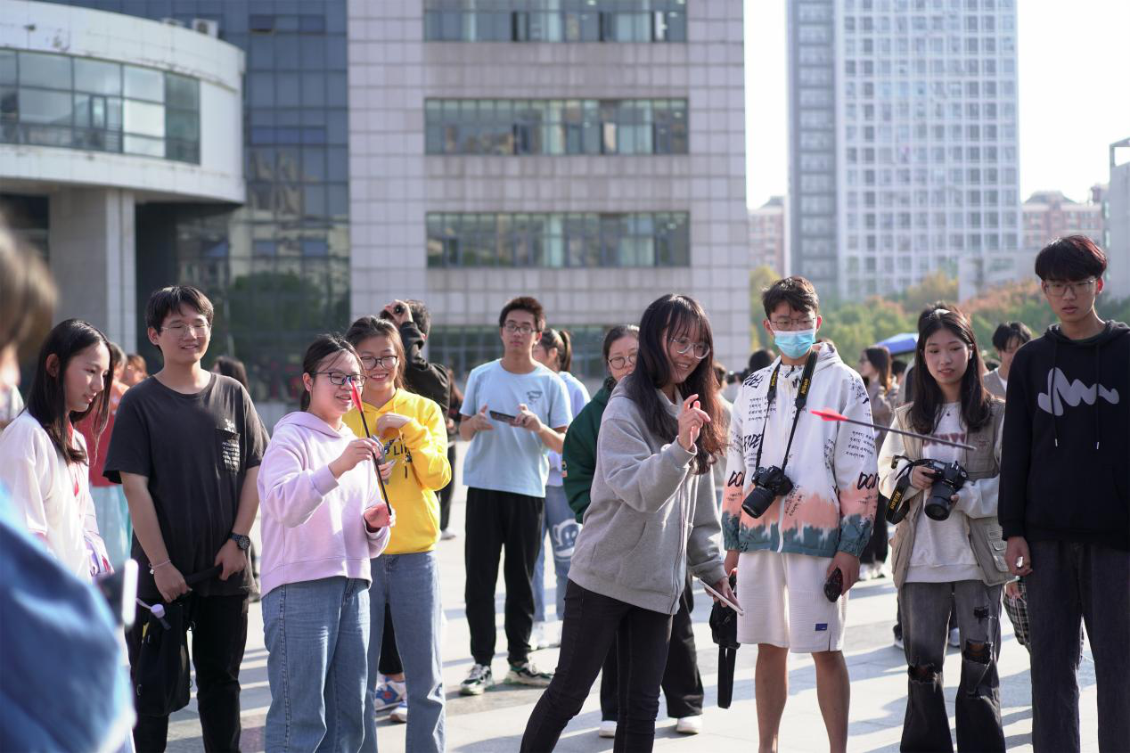 下午两点,音乐响起,越来越多身着传统服饰的师生集聚在青春广场,传统文化的氛围感逐渐拉满。同学们沉浸在各种有趣又有挑战性的活动中。来自机械学院的王宝瑞和袁子昂同学在抽陀螺活动上得心应手,袁子昂同学说:“我第一次玩这个,全靠他教我呢。”说着,拍了拍身边的王宝瑞同学。