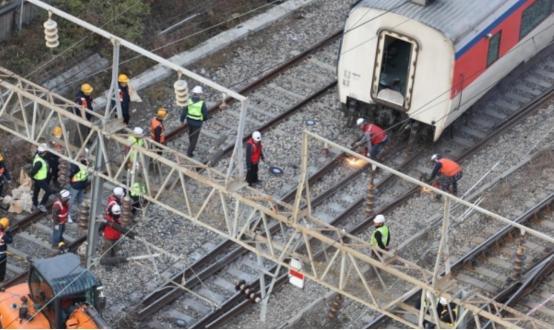 7日上午,韩国铁道公社正在发生列车脱轨事故的永登浦站附近进行铁路修复工作。 图自韩媒