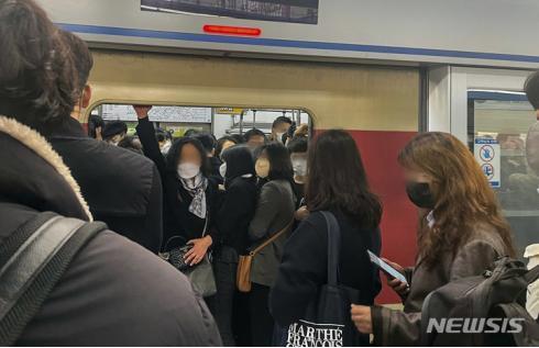 7日早高峰时段,首尔地铁1号线相关车站站台及车厢内情况。 图自韩媒