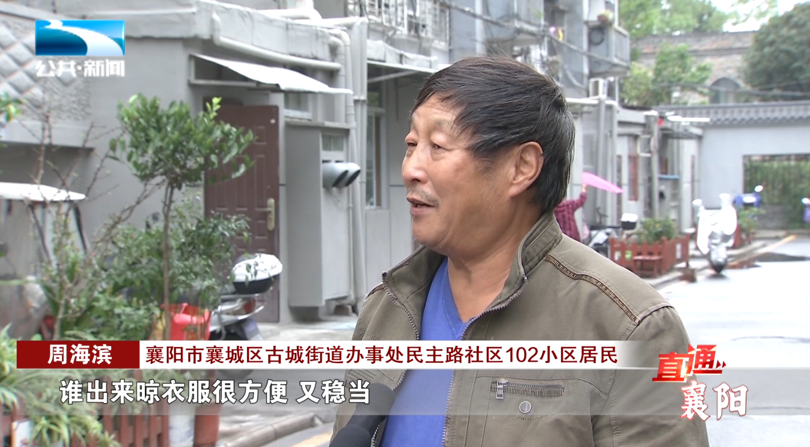 襄阳市襄城区古城街道办事处民主路社区102小区居民 周海滨:“就在楼道的楼台上装上龙门式的,谁出来晾衣服很方便,又稳当,不存在有危险,安全一些,也不影响美观。”