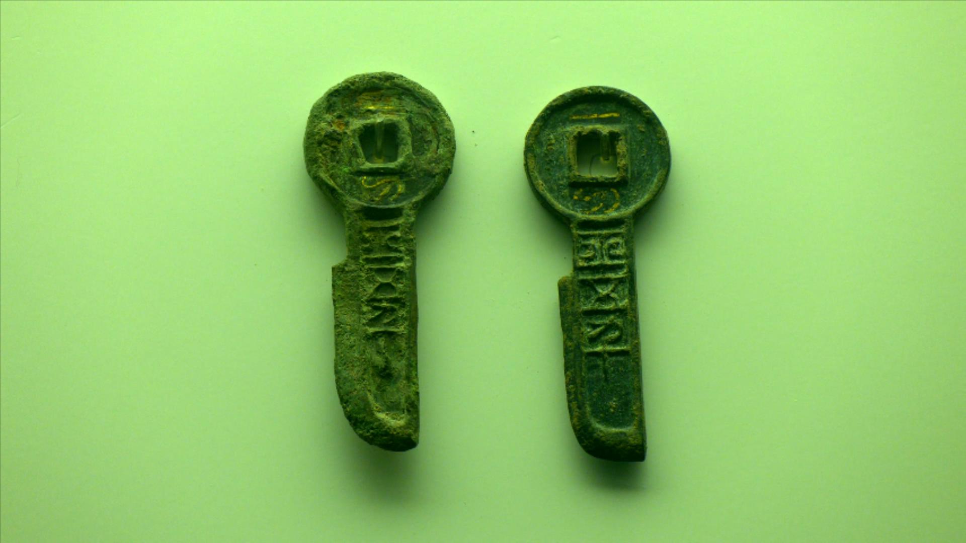 中南财经政法大学文物鉴赏与讲解协会志愿讲解员 张怡:我要给大家介绍一种钱币,叫做一刀平五千,它分为环柄和刀身两部分,环柄为方孔圆形钱,其上有黄金镶嵌的“一刀”两字,故也被称作为是“金错刀”,故事中有云:美人赠我金错刀,何以报之英琼瑶。为什么向大家介绍一刀平五千呢?因为它是王莽时期铸造的非常具有代表性的钱币,它的铸造十分精美,而且这也使得王莽获得了铸币高手的美誉。在明朝货币展区藏有该馆的镇馆之宝——泰昌通宝折五钱。其外形为圆形,中间有正方形孔,货币上铸有“泰昌通宝”四个字。