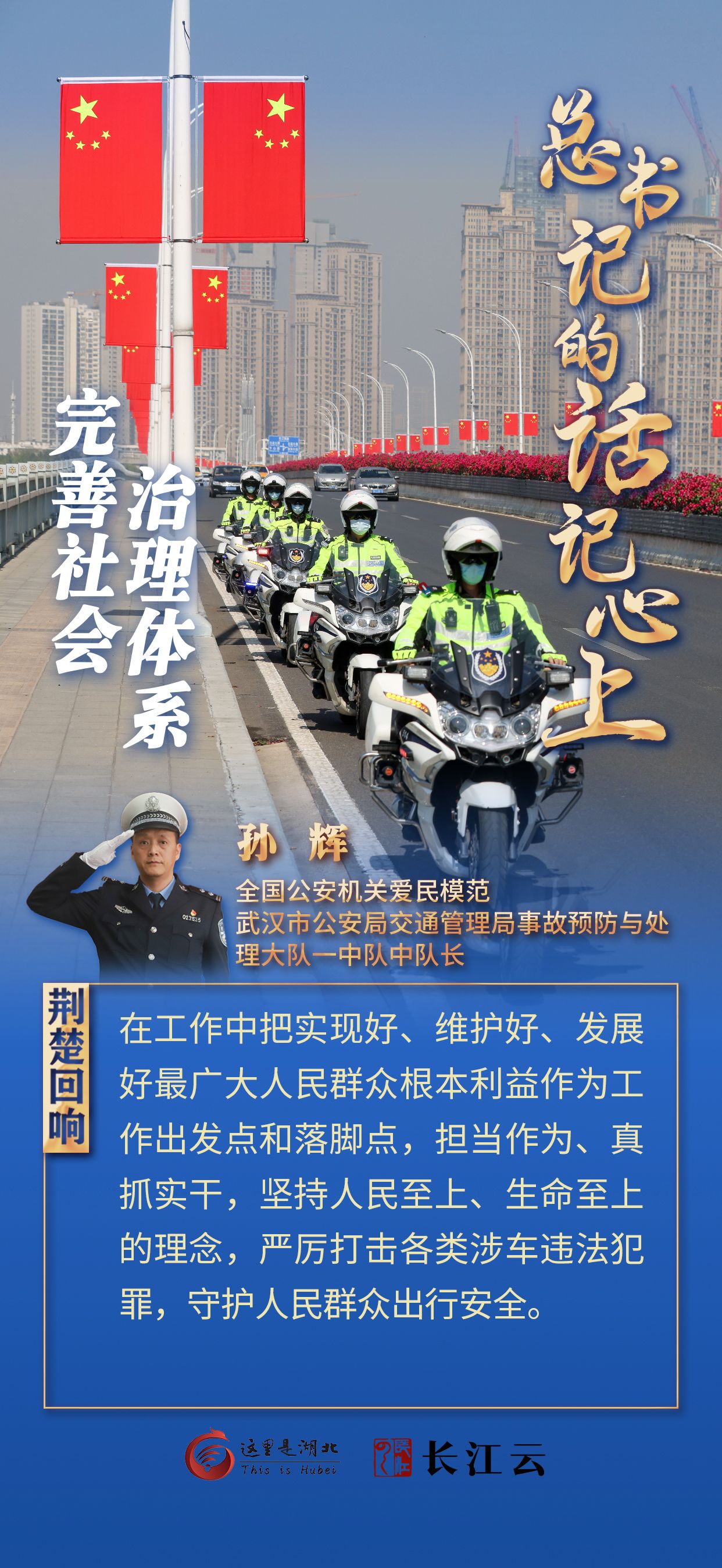 全国公安机关爱民模范、武汉市公安局交通管理局事故预防与处理大队一中队中队长孙辉:党的二十大报告指出,加快推进市域社会治理现代化,提高市域社会治理能力。作为基层公安民警,身逢新时代新征程,惟有不懈奋斗才能不辜负时代重托。我将在工作中把实现好、维护好、发展好最广大人民群众根本利益作为工作出发点和落脚点,担当作为、真抓实干,坚持人民至上、生命至上的理念,严厉打击各类涉车违法犯罪,守护人民群众出行安全。