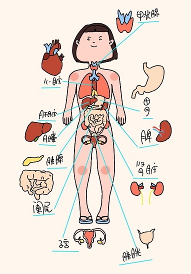 腹部:肝、胆囊、脾、胰、肾、肾上腺、胃、肠道、膀胱、前列腺、子宫、阴囊等;