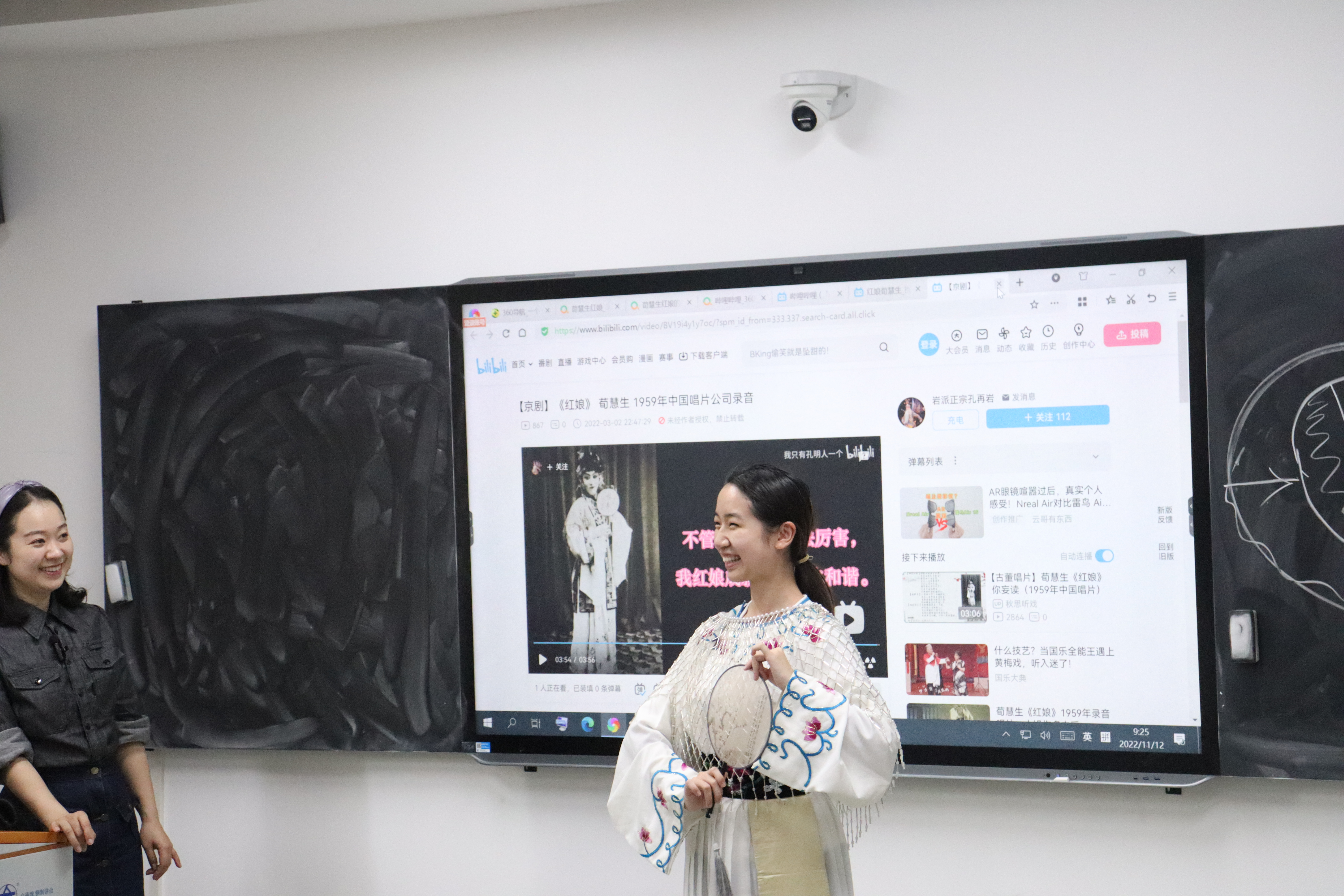 陆艺君以《西厢记》为例,讲解了京剧唱腔及行腔中所体现的“圆”的艺术特征,并通过“指”“看”“听”“走”四个动作和《红娘》片段的表演,向同学们生动呈现了京剧欲前先后、欲放先收的独特韵味和字正腔圆的京腔魅力。