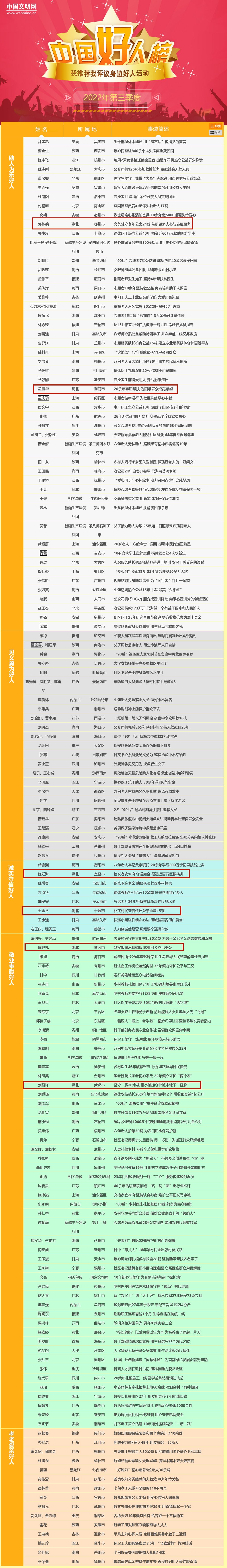 上榜好人中,有扎根深山二十载,造林千亩献国家的河南退休职工马怀智;有父子俩奋不顾身从湍急河流中救出落水老人,父亲却在救人中不幸离世的陕西农民程宝存、程建军;有信守承诺,36年坚持替战友尽孝的江苏退伍老兵李发安;有躬耕司法行政戒毒事业29年,用情帮助1000多名戒毒人员有效戒断毒品的海南警察陈旭;有兑现对离世母亲的承诺,49年不离不弃照顾4位残疾家人的广东退休工人岑奕浩……一个个闪耀的名字,镌刻着伟大时代的凡人善举;一件件感人的事迹,讴歌了崇德向善的高尚情怀。他们是我们身边的英雄,他们是我们时代的脊梁。