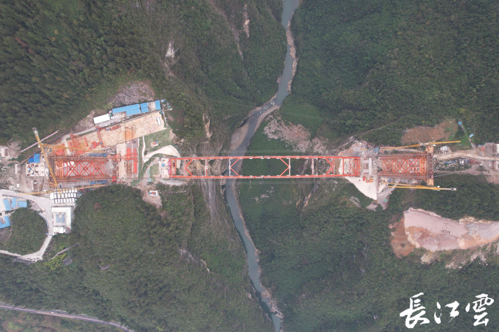 李一石解释,采用拱桥方案就势必需要架拱以及桥面拼接。由于空间狭窄,常规的起重装备直接起吊显然不可取。为此,建设者们在桥梁段分别建起高149.4米、155.4米的扣缆塔,在此基础上用两根长1000米的主缆索将两端相连,形成一个悬索桥的结构,然后进行钢拱安装及梁片吊装架设。大桥拱肋共计分为50个节段,最大吊重节段重量135吨,相当于100辆小汽车的重量。