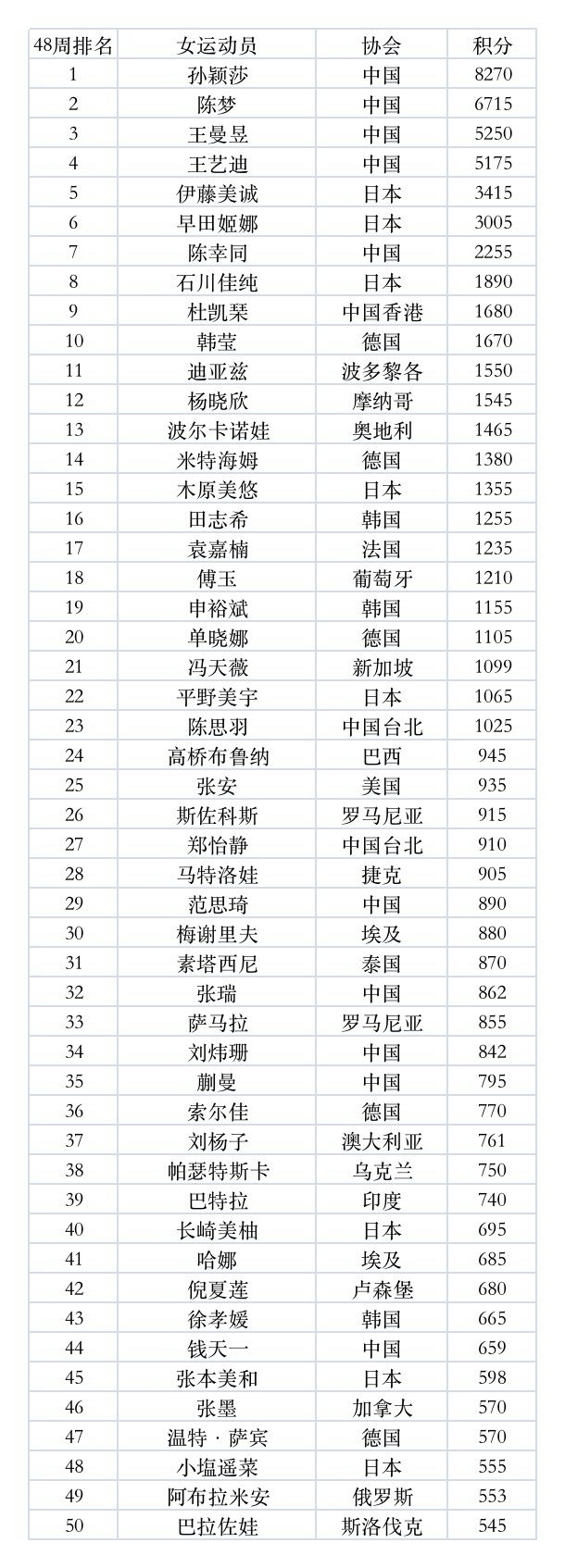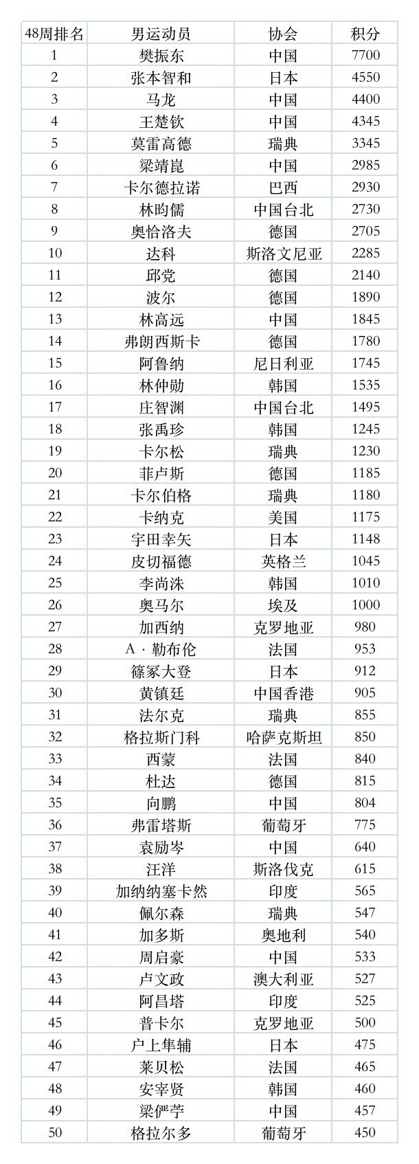 国际乒联11月29日公布了2022年第48周世界排名。