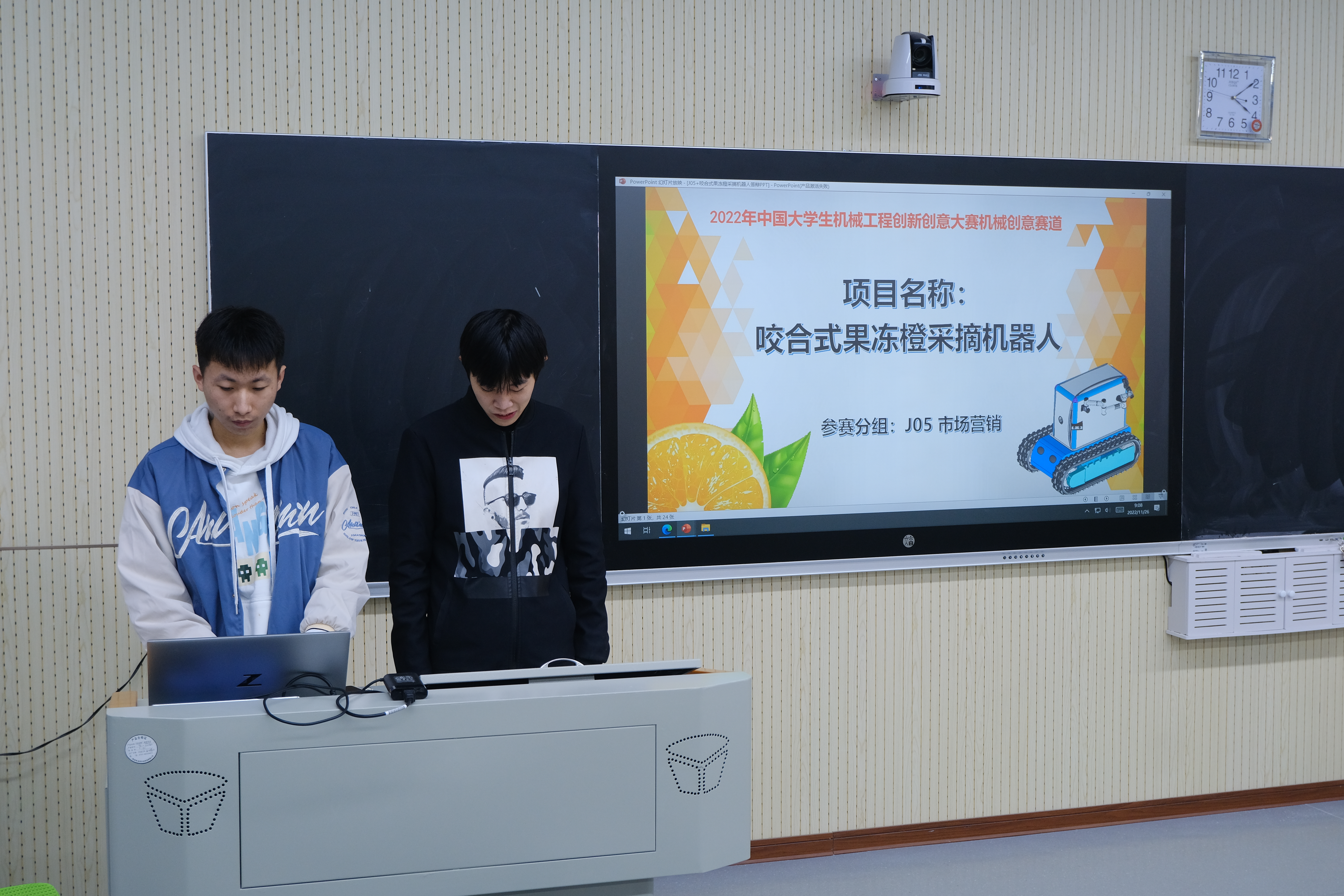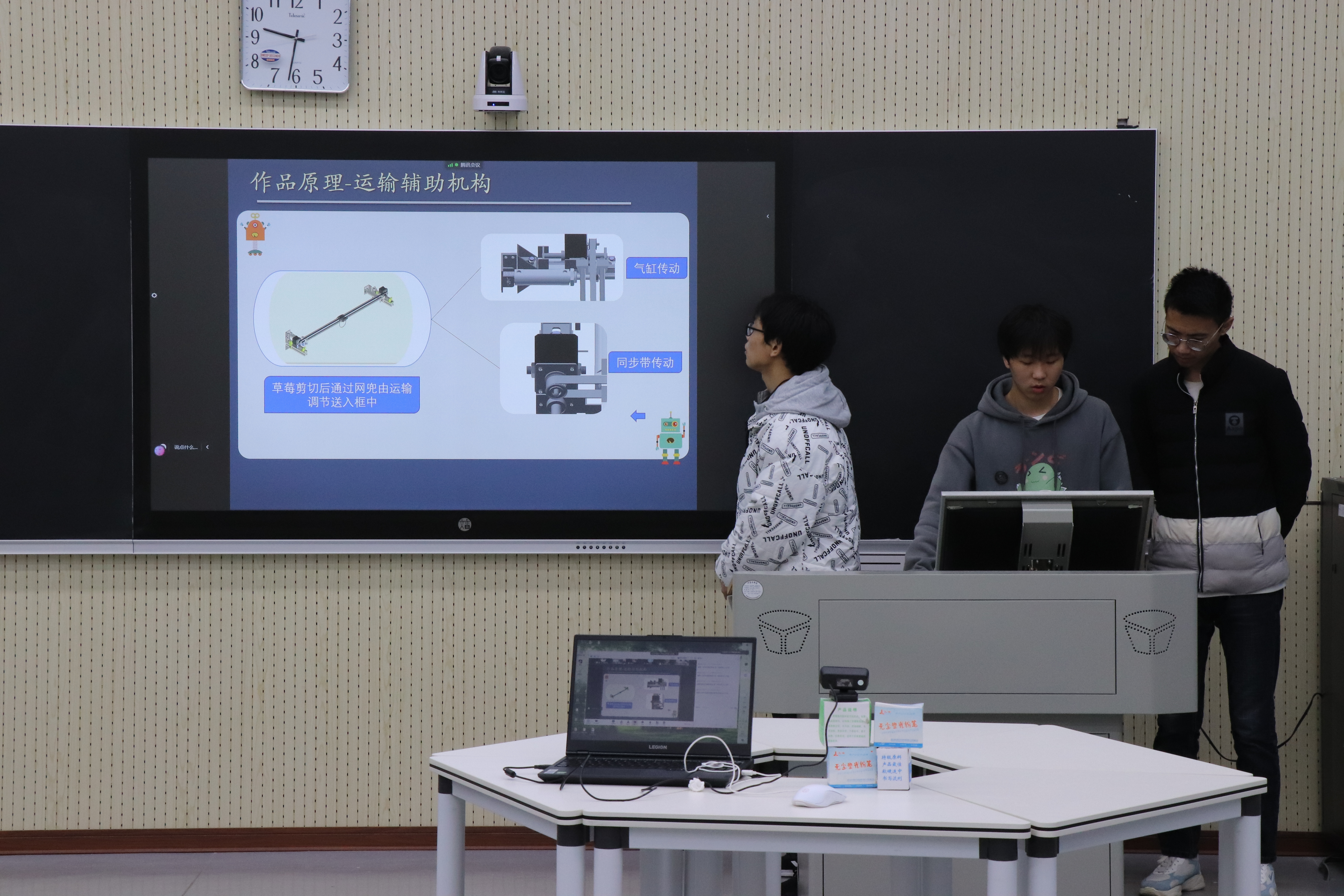 “刺梨是一种多生长在贵州地区的水果,枝条繁多堆叠且有刺,人工采摘极易弄伤手指。经过调研,我们小组设计了一个分离机构,先在堆叠的枝条中找到一根枝条,用枝条分离机构夹取该枝条的端部,将它拉到一个水平位置方便摘取,并用枝条分离机构的分离爪分拣开它四周的枝条,再对该枝条上的果实进行摘取。这样既可以保护工人手指,又极大地提高采摘效率,节约生产成本。”答辩现场,来自武昌首义学院机制(智能制造)2002班的黎震向评委展示了自己团队设计的高效刺梨采摘机。