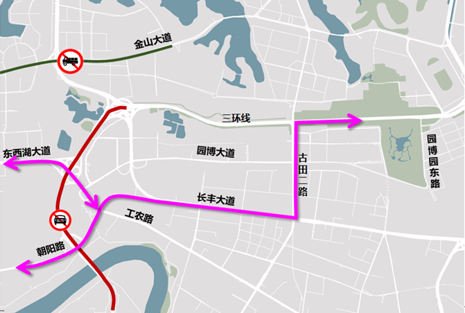 (2)可绕行古田二路、长丰大道、朝阳路(朝阳路、长丰大道、古田二路为白天时段流量较大,驾驶员绕行前请通过导航提前查询路况,避开拥堵时段)。
