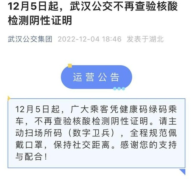 刚刚,武汉公交集团发布运营公告:12月5日起,广大乘客凭健康码绿码乘车,不再查验核酸检测阴性证明。请主动扫场所码(数字卫兵),全程规范佩戴口罩,保持社交距离。感谢您的支持与配合。