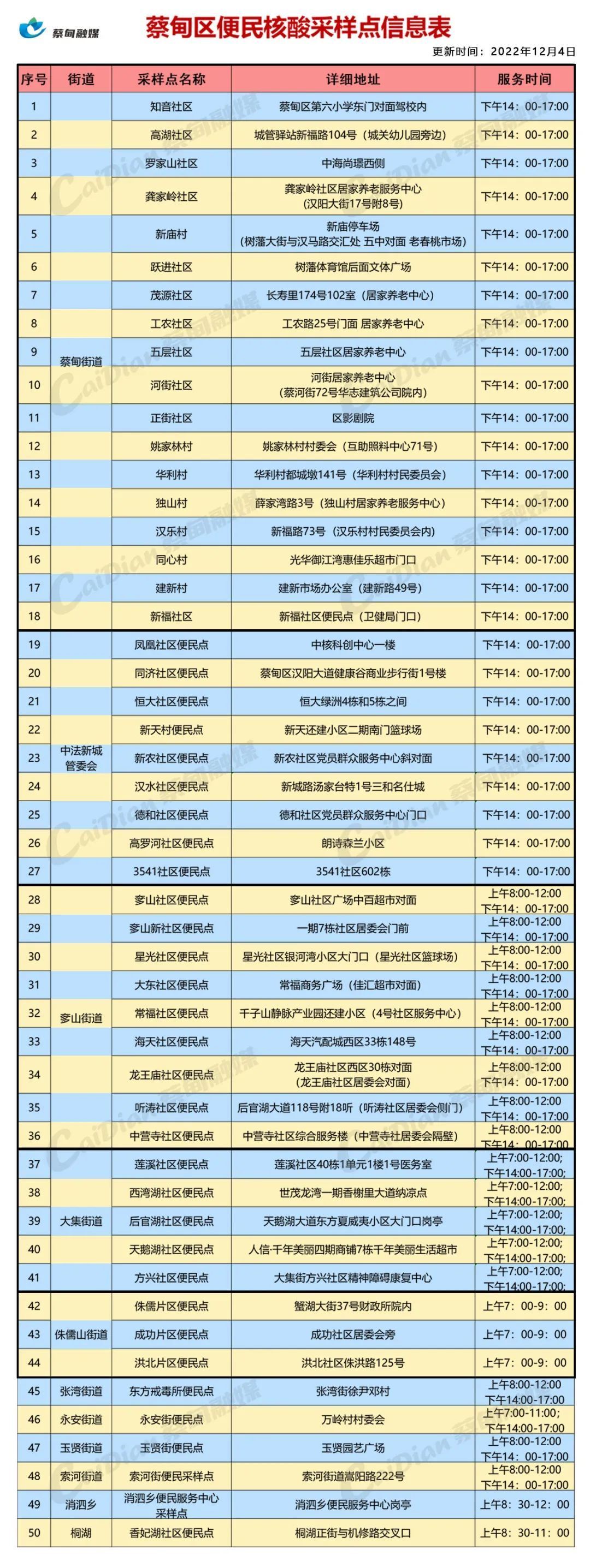 为方便居民核酸检测,现将蔡甸区核酸检测便民点安排调整如下,便民核酸点位及时间详见列表(非辖区居民在便民点检测核酸结果上传存在延迟,敬请谅解)。本安排自2022年12月5日起施行。根据实际情况,如有调整另行通知。