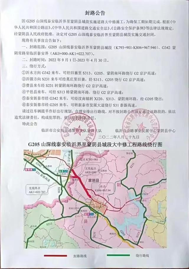 今年8月,临沂市公安局交通警察支队蒙阴大队、临沂市公路事业发展中心蒙阴县中心发布了一份公告,因G205山深线泰安临沂界至蒙阴县城段实施道路大中修施工,为确保工期如期完成,根据《中华人民共和国公路法》《中华人民共和国道路交通安全法》《公路安全保护条例》等法律法规规定,经蒙阴县人民政府批准,决定对G205山深线泰安临沂界至蒙阴县城段实施交通封闭。封路时间自2022年9月1日到2023年4月30日。