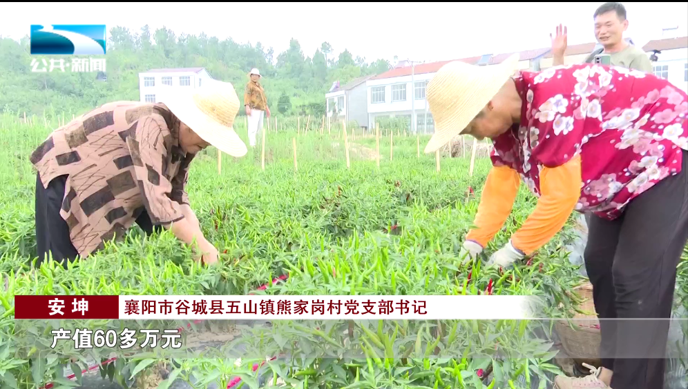 襄阳市谷城县五山镇熊家岗村党支部书记 安坤:“今年我们100亩的辣椒喜获丰收,总产量达到30多万斤,产值60多万元,吸纳了200多户农户加入,平均每户增收2000多元。”