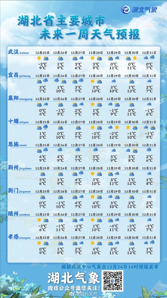 昨天(24日),湖北全省晴天到多云。最高气温鄂西北7~11℃、其他地区11~16℃。今晨最低气温北部-4~-1℃、南部-1~3℃,省内有31个县市在0℃以下,随州最低-4.4℃。