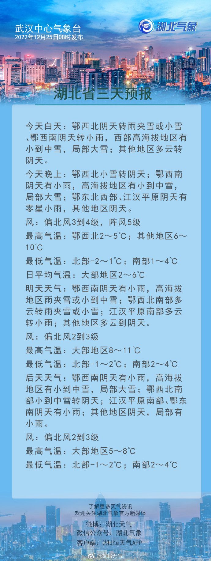 今明两天,受高空波动和地面弱冷空气影响,湖北省西部将有雨雪来袭,天气湿冷。今天白天,鄂西北阴天转雨夹雪或小雪,鄂西南阴天转小雨,西部高海拔地区有小到中雪,局部大雪,其他地区多云转阴天。到了晚上,鄂西北雨雪渐止。雨雪发展的同时,今天北风加强,气温下降,鄂西北最高气温降至2~5℃,其他地区6~10℃。明天鄂西北南部又有雪花现身,鄂西南阴天有小雨,高海拔地区有雨夹雪或小到中雪。大部地区最高气温8~11℃。后天雨带转移到南部地区,降水范围扩大,大部地区最高气温降至5~8℃。