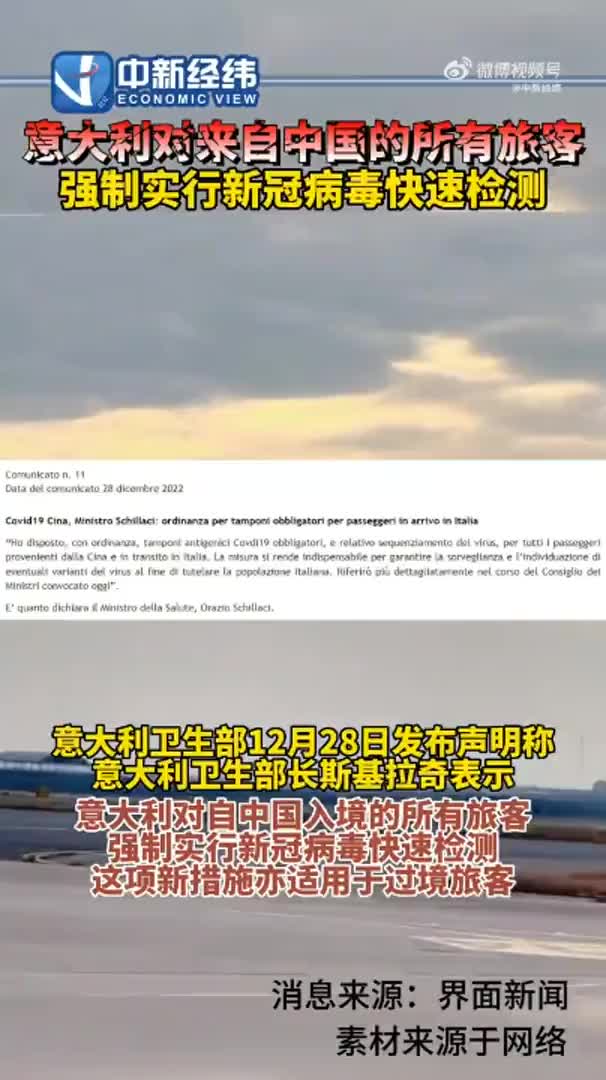 意大利卫生部12月28日发布声明称,卫生部长斯基拉奇表示,意大利对自中国入境的所有旅客强制实行新冠病毒快速检测,这项新措施亦适用于过境旅客。斯基拉奇称,他将在当地时间周三晚召开的意大利内阁会议上提供更详细的报告。意大利政府消息人士透露,斯基拉奇称,意方“要求欧盟伙伴采取同样做法”。