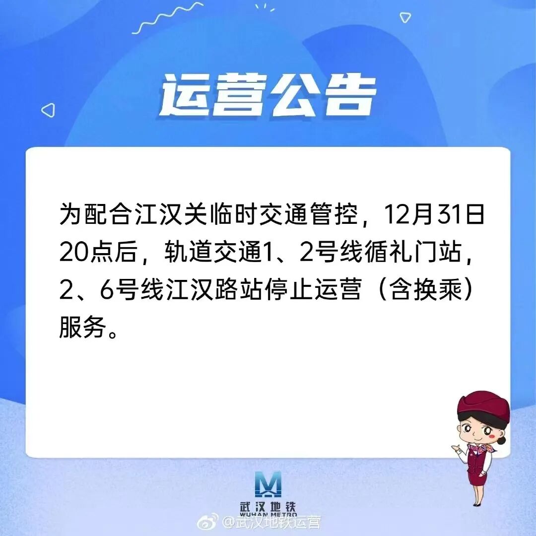记者从武汉地铁运营公司获悉,为配合江汉关临时交通管控,12月31日20点后,轨道交通1、2号线循礼门站,2、6号线江汉路站停止运营(含换乘)服务。