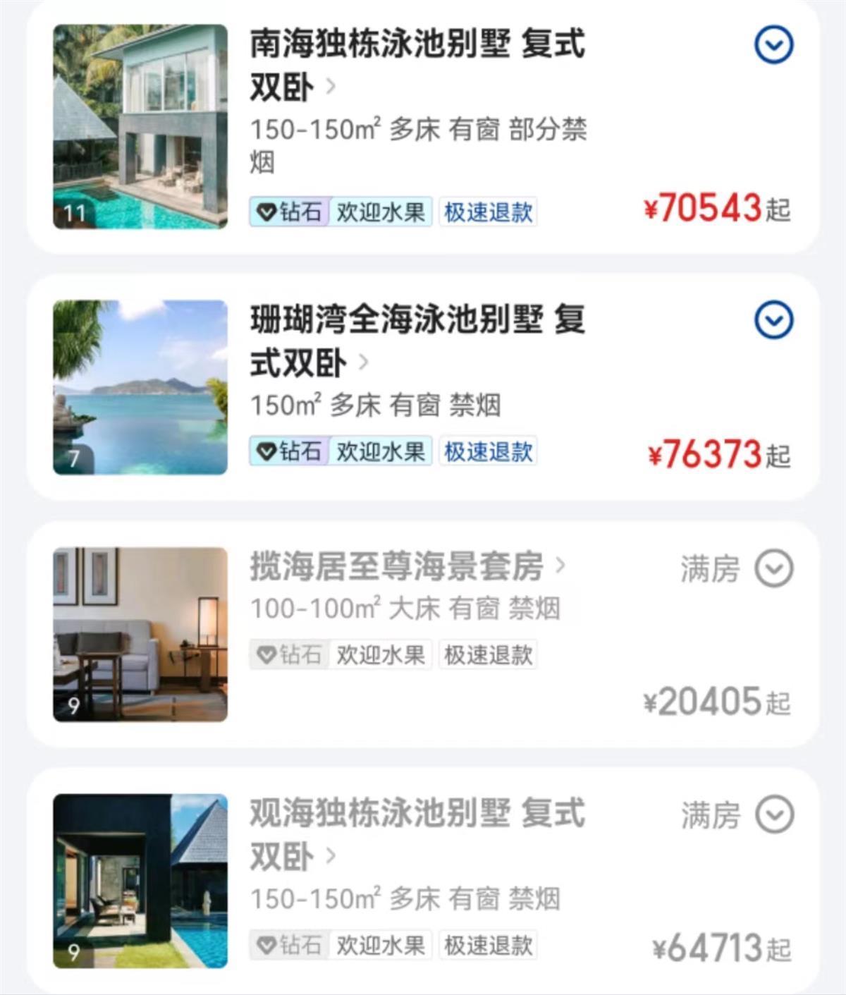 在住宿上,极目新闻记者对比多家五星级酒店春节期间预订价格发现,目前广西北海多家酒店普通大床房的预订价在一千五百元左右,海南万宁的在两千多元,且多家酒店工作人员均表示房间紧张,而到了三亚,不少酒店预订价格则突破了三千元,有的达到五六千元,景致好的会突破万元。
