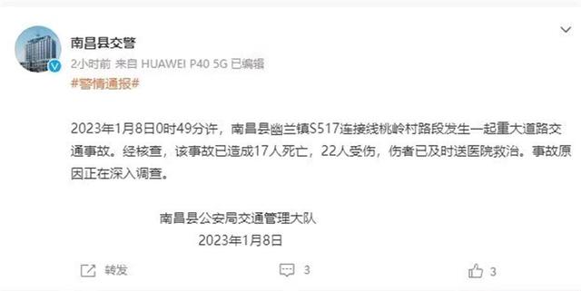 据南昌县公安局交通管理大队通报,2023年1月8日0时49分许,南昌县幽兰镇S517连接线桃岭村路段发生一起重大道路交通事故。经核查,该事故已造成17人死亡,22人受伤,伤者已及时送医院救治。事故原因正在深入调查。