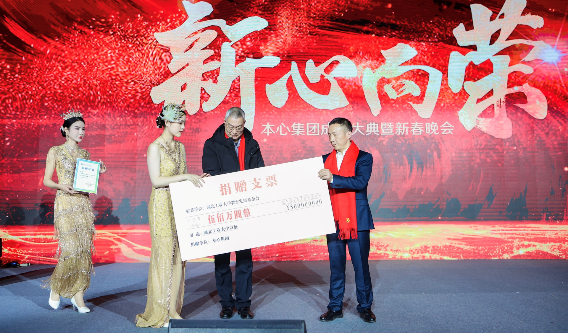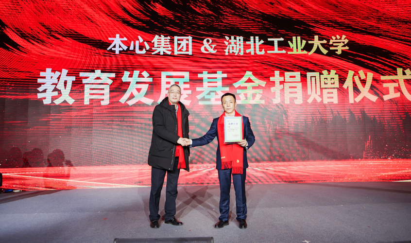 1 月 16 日晚,本心集团向湖北工业大学教育发展基金会捐赠仪式在武汉举行。本心集团董事长、湖北工业大学兼职教授、创业导师吴世军,湖北工业大学党委副书记、校长冯征出席了捐赠仪式。