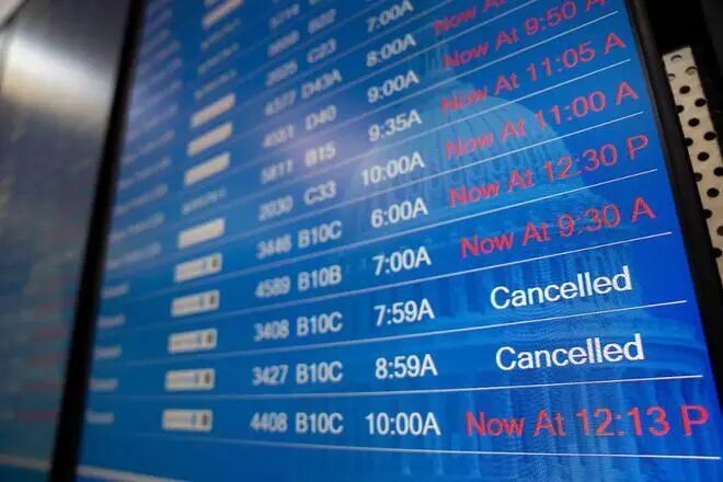 当地时间1月11日,在美国弗吉尼亚州阿灵顿里根国家机场,信息显示众多航班延误或取消。