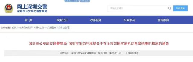 近日,深圳交警发布通告,将在全市范围禁止机动车鸣喇叭。通告即日起至2024年1月21日施行。